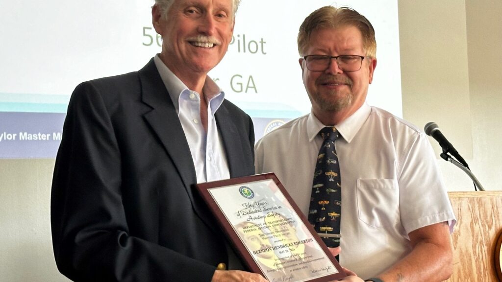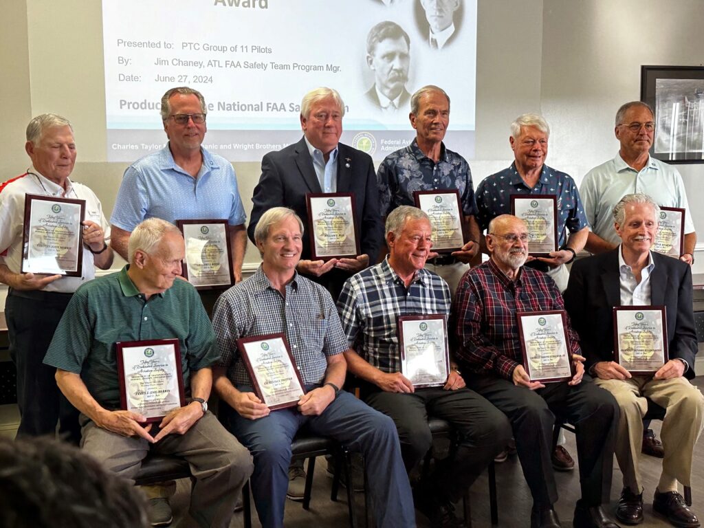On June 27, 2024, FAA Safety Inspector Jim Chaney presented eleven FAA Wright Brothers Master Pilot awards at the Commemorative Air Force (AF) hanger in Peachtree City. Among the recipients were former DPS instructors Captains Tim Morris and Bob Walden and current DPS instructor Captain Hendricks Edgerton.